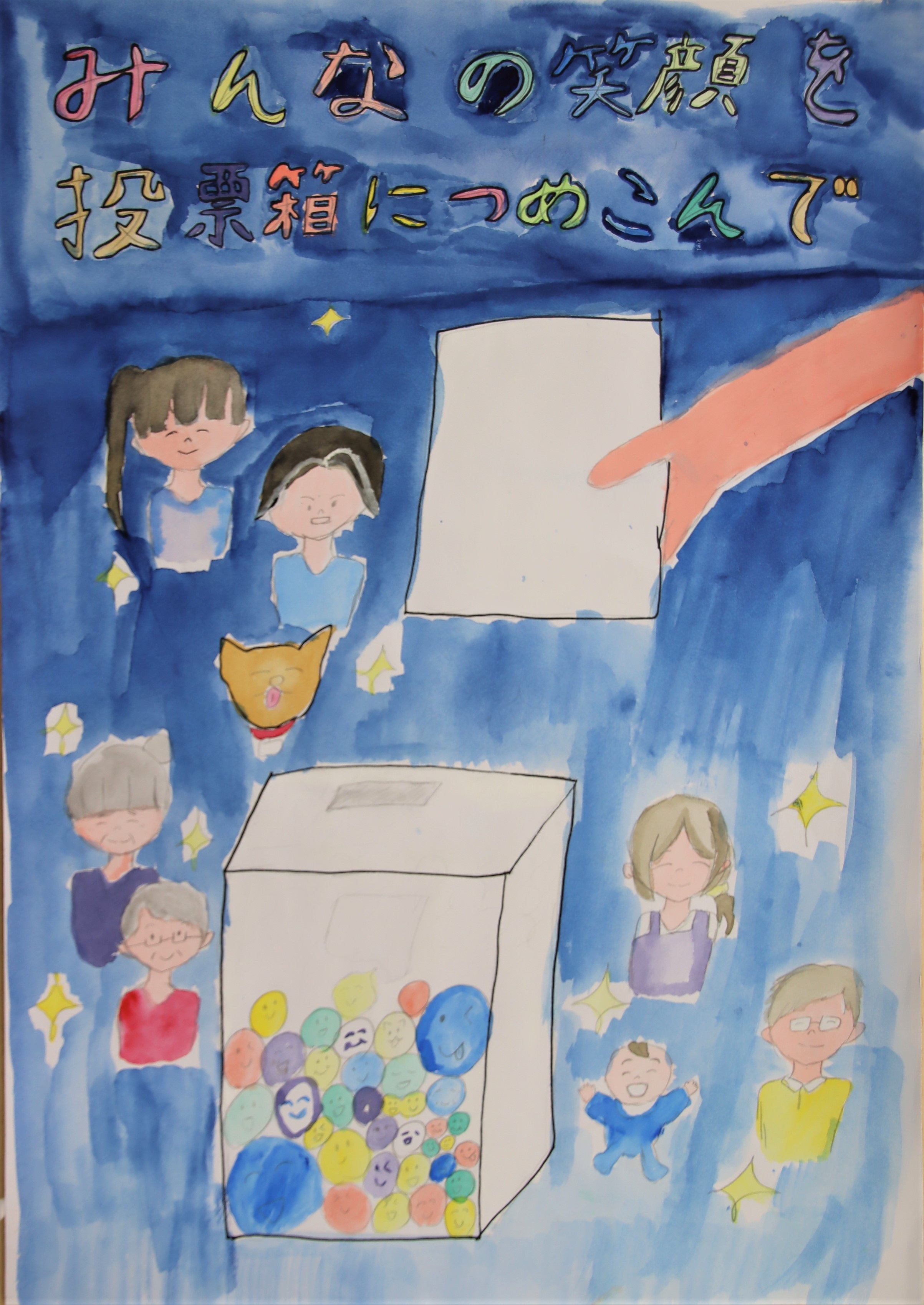 インパクトのある投票箱を中央に大きく描き、そこからみんなの笑顔が溢れていて、明るい街を表現した。