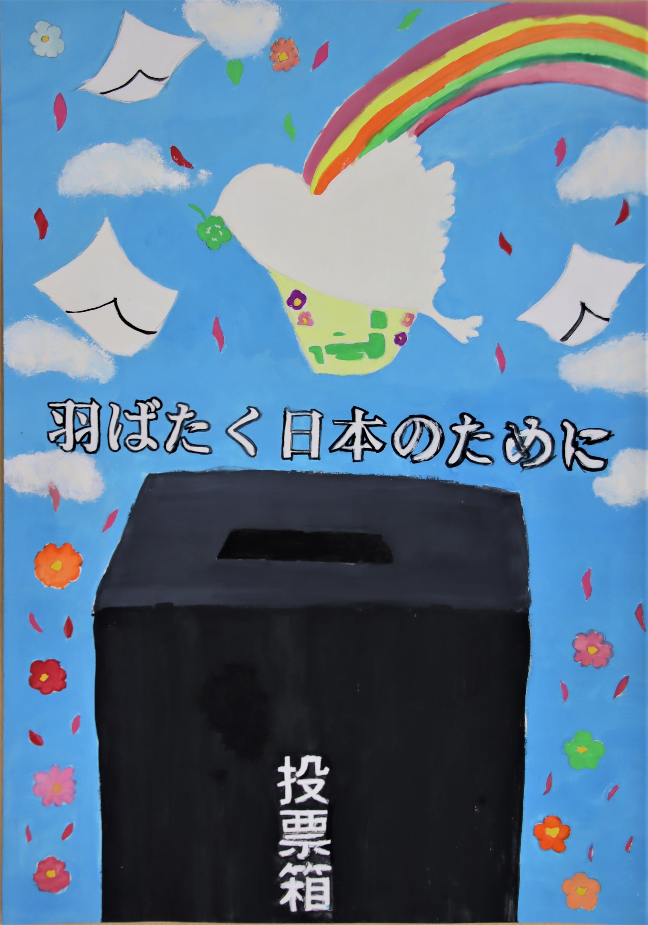 大きく描かれた標語から投票に行きたい思いが強く伝わる作品となっている。ぜひ友達も誘って投票に行ってほしい。